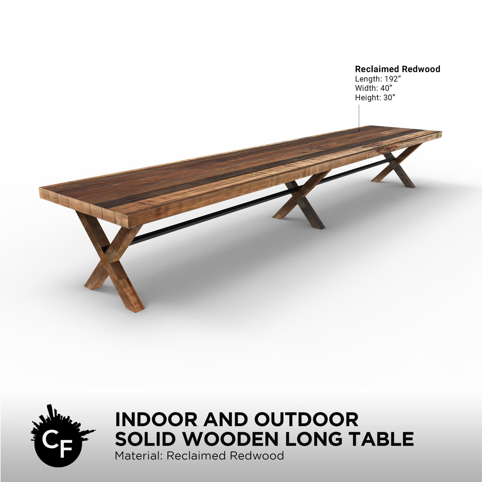 This antique-style 16 feet long, 40 inches wide and 30 inches tall reclaimed table will make a unique addition to your household or outdoor spaces. Its solid wood construction makes it flat and stable to sit on. This redwood table is made of reclaimed redwood from an old Chicago water tower. Our table is solid, durable and beautiful, and has the characteristics of redwood. Every piece of this furniture is unique, and slightly different from the next. Signs of wear and visible grain structure give each piece its own history and a unique look. This long redwood table is fully handmade. Our solid reclaimed redwood long table has a strong retro style. It will make a distinctive addition to your garden too! The differences in the grain and colors give this piece of furniture a unique character. Every step of the process is carried out with the greatest care, be it polishing, painting or lacquering.