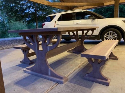 Walnut table and base with 2 matching Benches. If you look closely the base is hand designed with a unique look. The base is solid walnut too. This table is built to last my friends. Its durable, heavy duty, solid hardwood. Its family size. Can fit up to 10 people around all 4 sides.