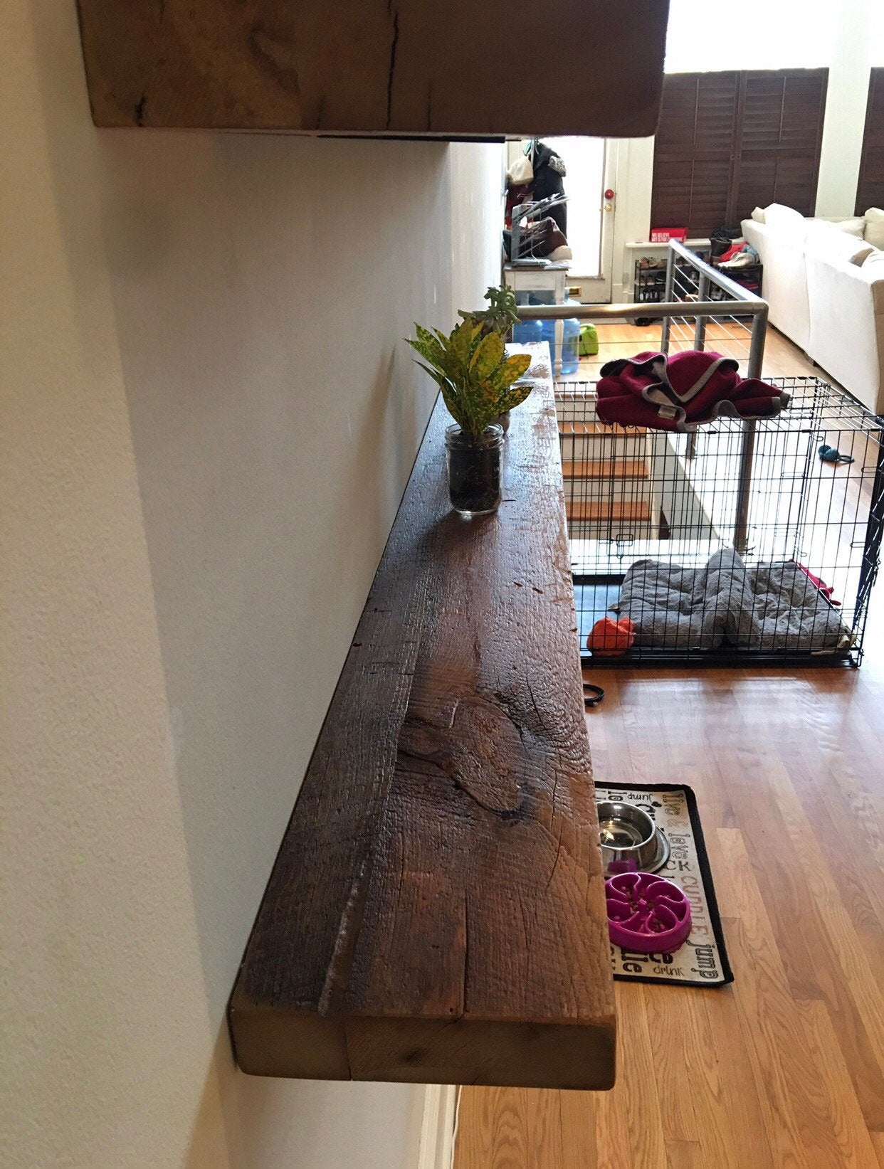 48" Longx 8" wide x 1.5" thick rustic shelves. Comes with a light sand and a poly finish. COmes with a Custom metal bracket mounting in the wood from beneath, theres slots routed in.